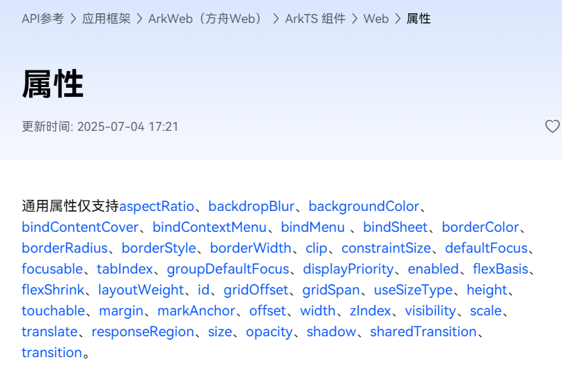 1 2 3 4 5 6 7 8 9 10 11 12 13 14 15 16 17 Web ({ src : this .url , controller : this .controller }) .width ('100%' ) .height ('100%' ) .onPageBegin (() => { this .isLoading = true ; }) .onPageEnd (() => { this .isLoading = false ; }) .onErrorReceive ((err ) => { console .error ('[ERROR] 网页加载失败:' , JSON .stringify (err)); prompt.showToast ({ message : '加载失败,请检查网络或网址' }); })