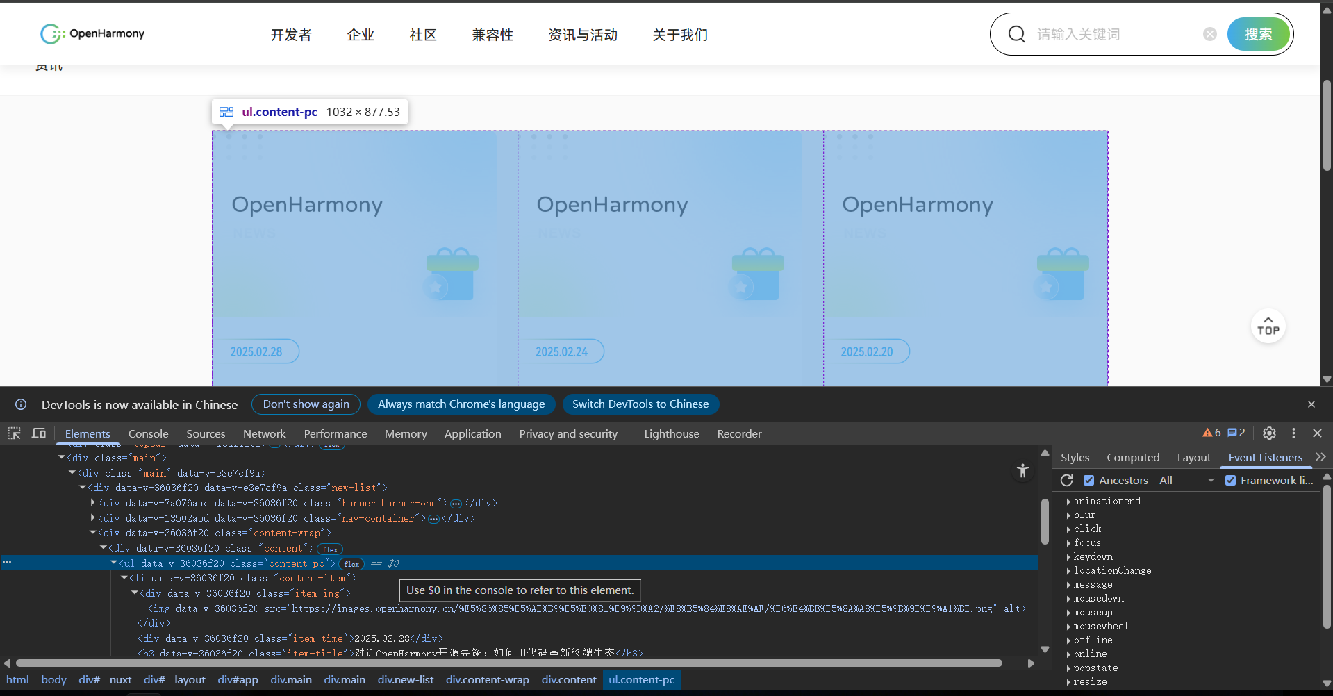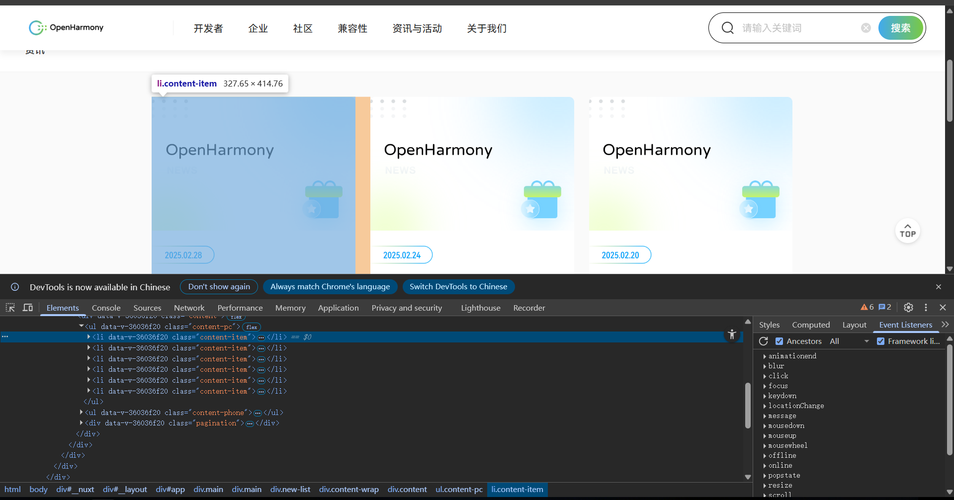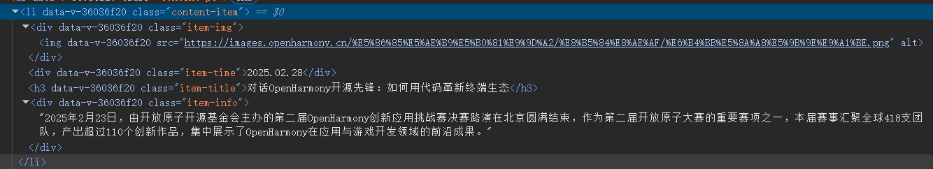 首先是OpenHarmony的官网,官网提供有很多的相关资讯,大多是以微信公众号的形式展现的,整体格式比较规整,我们先来进行爬取的尝试。