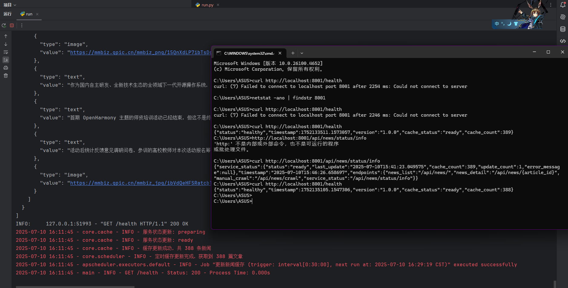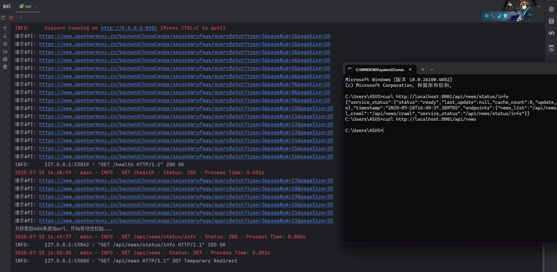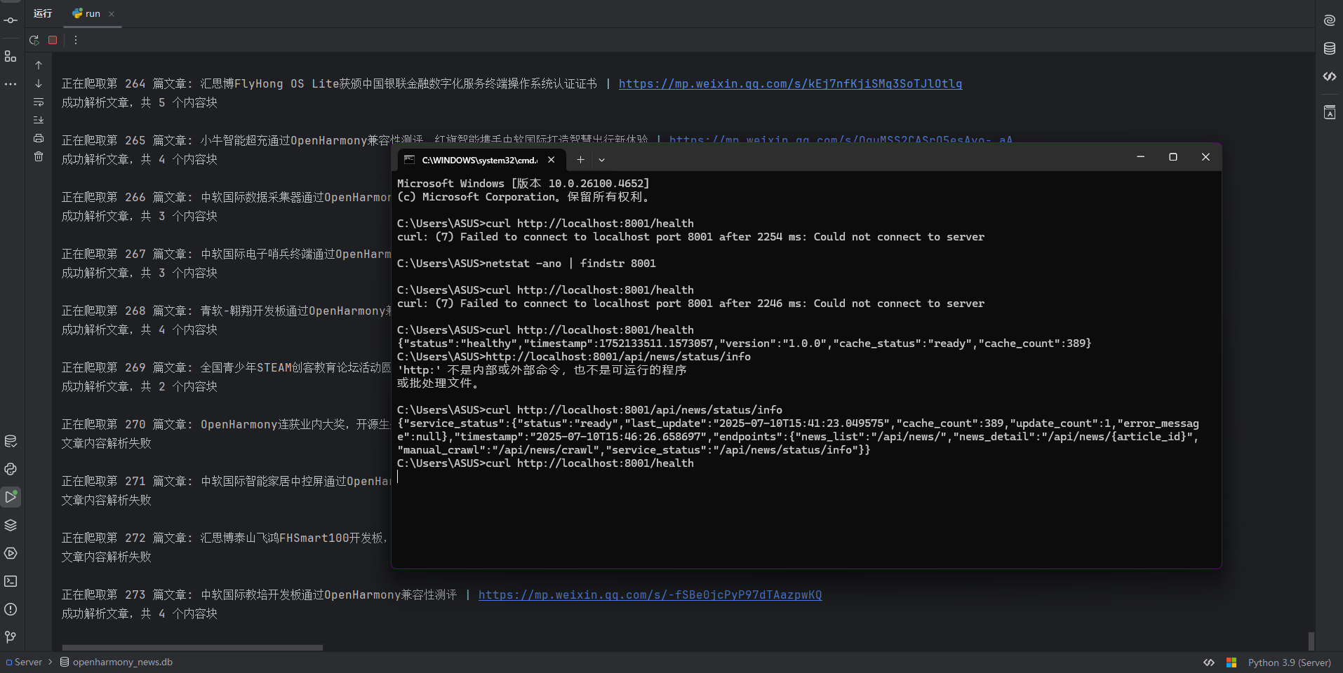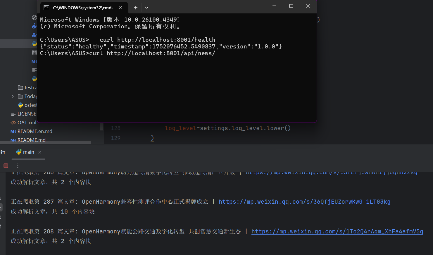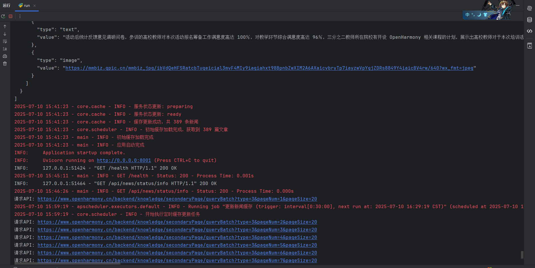 1 2 3 4 5 6 7 8 9 10 11 12 13 14 15 16 17 18 19 20 21 22 23 24 25 26 27 28 Server/ ├── api/ # API接口模块 │ ├── __init__.py # 包初始化文件 │ └── news.py # 新闻相关API接口 ├── core/ # 核心功能模块 │ ├── __init__.py # 包初始化文件 │ ├── config.py # 配置管理 │ ├── database.py # 数据库操作 │ ├── logging_config.py # 日志配置 │ └── scheduler.py # 定时任务调度 ├── models/ # 数据模型 │ ├── __init__.py # 包初始化文件 │ └── news.py # 新闻数据模型 ├── services/ # 服务层 │ ├── __init__.py # 包初始化文件 │ └── openharmony_crawler.py # OpenHarmony爬虫服务 ├── logs/ # 日志文件目录 │ ├── openharmony_api_20250709.log # 应用日志 │ └── error_20250709.log # 错误日志 ├── __pycache__/ # Python缓存文件 ├── .gitignore # Git忽略文件 ├── Dockerfile # Docker镜像配置 ├── docker-compose.yml # Docker Compose配置 ├── main.py # 主应用入口 ├── openharmony_news.db # SQLite数据库文件 ├── README.md # 项目说明文档 ├── requirements.txt # Python依赖包 └── run.py # 应用启动脚本