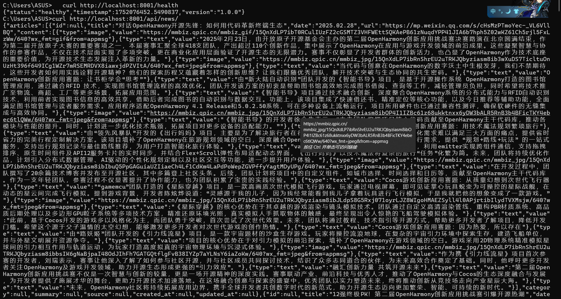 1 2 3 4 5 6 7 8 9 10 11 12 13 14 15 16 17 18 19 20 21 22 23 24 25 26 27 28 29 30 31 32 33 34 35 36 37 38 39 40 41 42 43 44 45 46 47 48 49 50 51 52 53 54 55 56 57 58 59 60 61 62 63 64 65 66 67 68 69 70 71 72 73 74 75 76 77 78 79 80 81 82 83 84 85 86 87 88 89 90 91 92 93 94 95 96 97 98 99 100 101 102 103 104 105 106 107 108 109 110 111 112 113 114 115 116 117 118 119 120 121 122 123 124 125 126 127 128 129 130 131 132 133 134 135 136 137 138 139 140 141 142 143 144 145 146 147 148 149 150 151 152 153 154 155 156 157 158 159 160 161 162 163 164 165 166 167 168 169 170 171 172 173 174 175 176 177 178 179 180 181 182 183 184 185 186 187 188 189 190 191 192 193 194 195 196 197 198 199 200 201 202 203 204 205 206 207 208 209 210 211 212 213 214 215 216 217 218 219 220 221 222 223 224 225 226 227 228 229 230 231 232 233 234 235 OpenHarmony官网新闻爬虫启动... 注意:此脚本需要安装以下依赖: pip install requests beautifulsoup4 -------------------------------------------------- 请求API: https: 正在爬取第 1 篇文章: 对话OpenHarmony开源先锋:如何用代码革新终端生态 | https: 成功解析文章,共 21 个内容块 正在爬取第 2 篇文章: 12 强终极PK!第二届OpenHarmony创新应用挑战赛引爆开源热潮 | https: 文章内容解析失败 正在爬取第 3 篇文章: 第二届OpenHarmony创新应用挑战赛决赛路演队伍揭晓 | https: 文章内容解析失败 正在爬取第 4 篇文章: OpenHarmony社区2024 年度运营报告发布,致谢每一位生态共建者! | https: 文章内容解析失败 正在爬取第 5 篇文章: 开源鸿蒙社区恭祝全体开发者2025 新年快乐,新春大吉! | https: 文章内容解析失败 正在爬取第 6 篇文章: 共绘2025 年开源新蓝图,OpenHarmony社区项目管理委员会年度工作会议在深圳成功举办 | https: 成功解析文章,共 27 个内容块 ================================================== 爬取结果JSON: ================================================== [ { "title" : "对话OpenHarmony开源先锋:如何用代码革新终端生态" , "date" : "2025.02.28" , "url" : "https://mp.weixin.qq.com/s/cHsMzPTmoYec-_VL6VllBQ" , "content" : [ { "type" : "text" , "value" : "2025年2月23日,由开放原子开源基金会主办的第二届OpenHarmony创新应用挑战赛决赛路演在北京圆满结束,作为第二届开放原子大赛的重要赛项之一,本届赛事汇聚全球418支团队,产出超过110个创新作品,集中展示了OpenHarmony在应用与游戏开发领域的前沿成果。这些凝聚智慧与协作的参赛作品,不仅在技术层面实现了多项突破,更在商业化应用层面验证了开源生态的无限潜力。赛事不仅彰显了开发者群体的创新活力,也凸显了OpenHarmony作为技术底座的重要价值,为开源技术生态发展注入革新的力量。" } , { "type" : "text" , "value" : "当代码与创意在OpenHarmony的数字沃土中生根发芽,我们不禁期待,这些开发者如何用实践诠释开源精神?他们的探索历程又蕴藏着怎样的创新思维?让我们跟随优秀团队,解开技术突破与生态协同的共生密码。" } , { "type" : "text" , "value" : "OpenHarmony创新应用赛题:让书柜学会“思考”" } , { "type" : "text" , "value" : "由“新大陆自动识别”团队开发的《智能书导》项目,是基于开源操作系统 OpenHarmony打造的图书馆管理应用,通过融合RFID 技术,实现图书馆管理流程的高效优化。团队开发该方案的初衷是帮助图书馆高效地完成图书借阅、查询等工作,减轻管理员负担,同时希望将技术推广至物流、商超、工厂等更多场景,拓展应用范围。" } , { "type" : "text" , "value" : "《智能书导》项目通过技术融合创新,深度整合OpenHarmony系统的分布式能力与RFID自动识别技术,利用前者实现图书信息的高效共享,借助后者完成图书的自动识别与数据交互。功能上,该项目集成了快速借还书、精准定位等核心功能,以及今日推荐等辅助功能,全面满足图书馆管理与读者服务需求。应用程序适配OpenHarmony 4.1 Release和5.0.2.50系统,可在多种设备上流畅运行,项目所用硬件也已通过兼容性测评,确保软硬件的无缝集成与高效协同。" } , { "type" : "text" , "value" : "《智能书导》的开发者徐金生表示:“未来团队将把项目核心代码贡献至OpenHarmony主干代码库,推动各模块与性能的提升。同时,计划进一步优化技术瓶颈,拓展项目对更多设备的适配能力。”" } , { "type" : "text" , "value" : "OpenHarmony创新应用赛题:用技术魔法规划繁琐旅行" } , { "type" : "text" , "value" : "由“领先风暴队”开发的《出行妈妈》项目,主要是为了解决旅行者在行程规划繁琐、信息整合困难以及个性化需求难以满足三大方面的痛点,提供省时省力的完美行程定制解决方案。该项目填补了OpenHarmony在旅游规划领域的空白,深度融合OpenHarmony 5.0.0 Release特性与旅游出行需求,提供 “规划+路线+玩法” 的一站式服务,支持出行规划记录与最佳路线推荐,为用户打造智能化旅行体验。" } , { "type" : "text" , "value" : "通过bindSheet绑定半模态组件,利用emitter实现跨组件通信,支持拖拽排序、原生时间组件及API12服务卡片的实时同步,并结合Flex+Scroll弹性布局适配动态界面,《出行妈妈》以技术魔法将复杂的旅行“任务”化繁为简。未来,团队将持续优化作品,计划引入分布式数据管理、AI驱动的个性化规划定制以及社区交互等功能,进一步提升用户体验。" } , { "type" : "text" , "value" : "在开发过程中,团队撰写了20余篇技术博客并发布至开源社区,其中多篇登上社区头条。后续,团队计划将项目中的自定义组件,如城市选择、时间选择和日历等,贡献至OpenHarmony主干代码库。作为